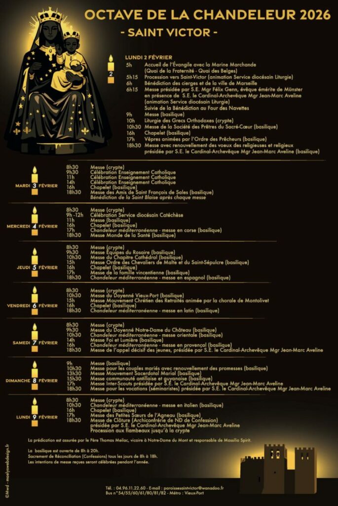 La tradition à Marseille remonterait à l’an Mille. Les fêtes de la Chandeleur durent 9 jours. Elles débutent le 2 février à 5h du matin. Une procession part alors du Vieux-Port et remonte jusqu’à l’Abbaye St Victor en passant par la Rue Sainte, les pèlerins ont pour la plupart des bougies allumées. La Vierge noire conservée toute l’année dans les Cryptes de l’Abbaye est couverte d’un manteau vert et présentée à la foule présente. L’archevêque bénit alors la vierge, les cierges verts et la ville qui s’offre devant lui et célèbre ensuite la messe.